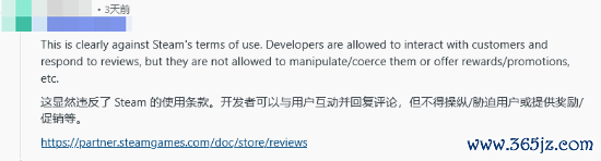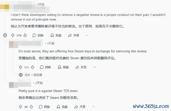 这则帖子很快引起了社区的广泛关注,绝大多数玩家认为,开发者主动联系玩家本身并无问题,但要求删除差评绝对是不恰当的做法,还有玩家指出,此举可能违反了Steam的服务条款。