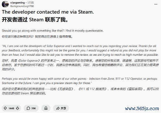 近日,一位名叫BackgroundLeg1788的玩家在Reddit上发帖表示,他在Steam游戏《Solar Expanse》留下差评后,竟收到了开发者希望删除评价的私信。